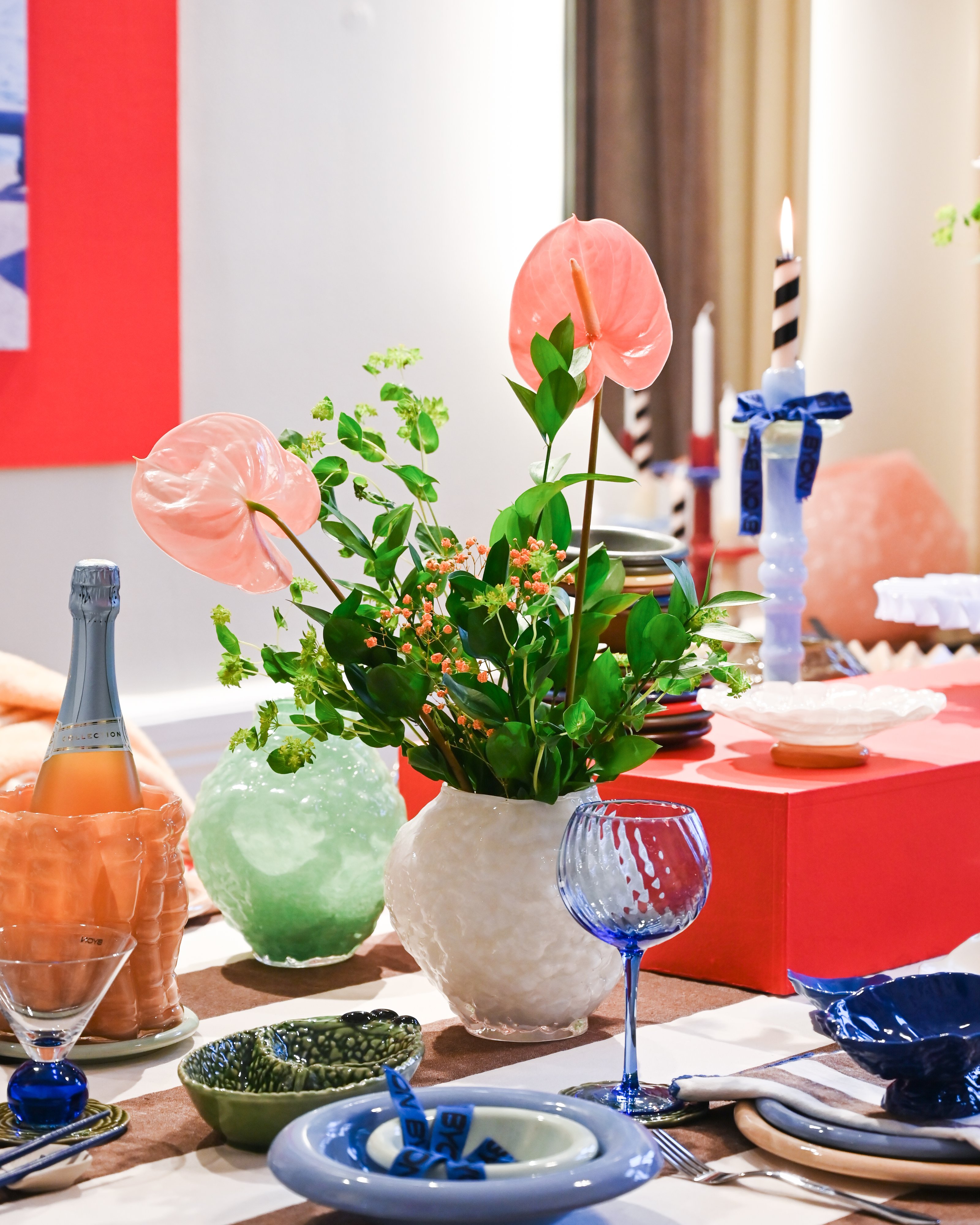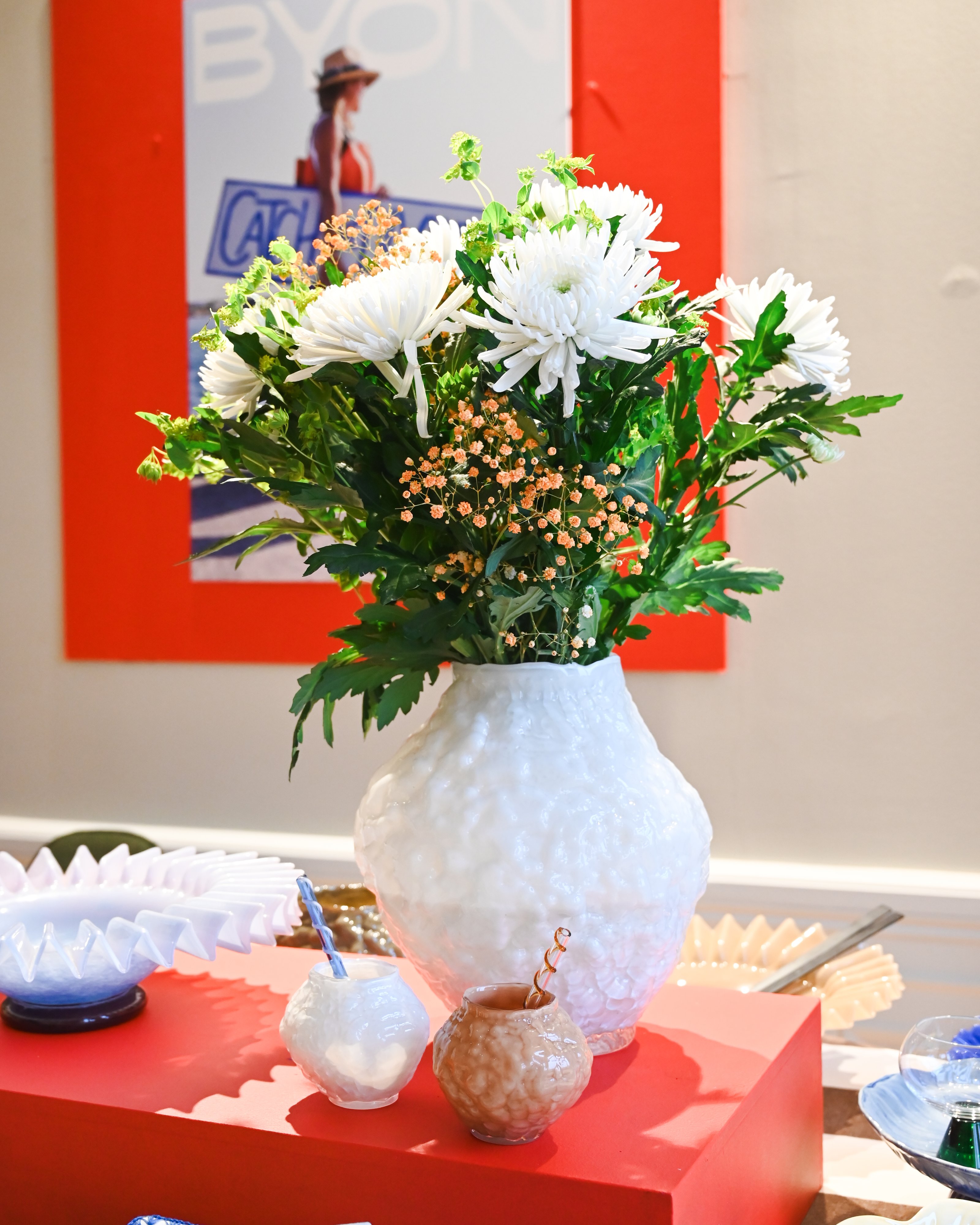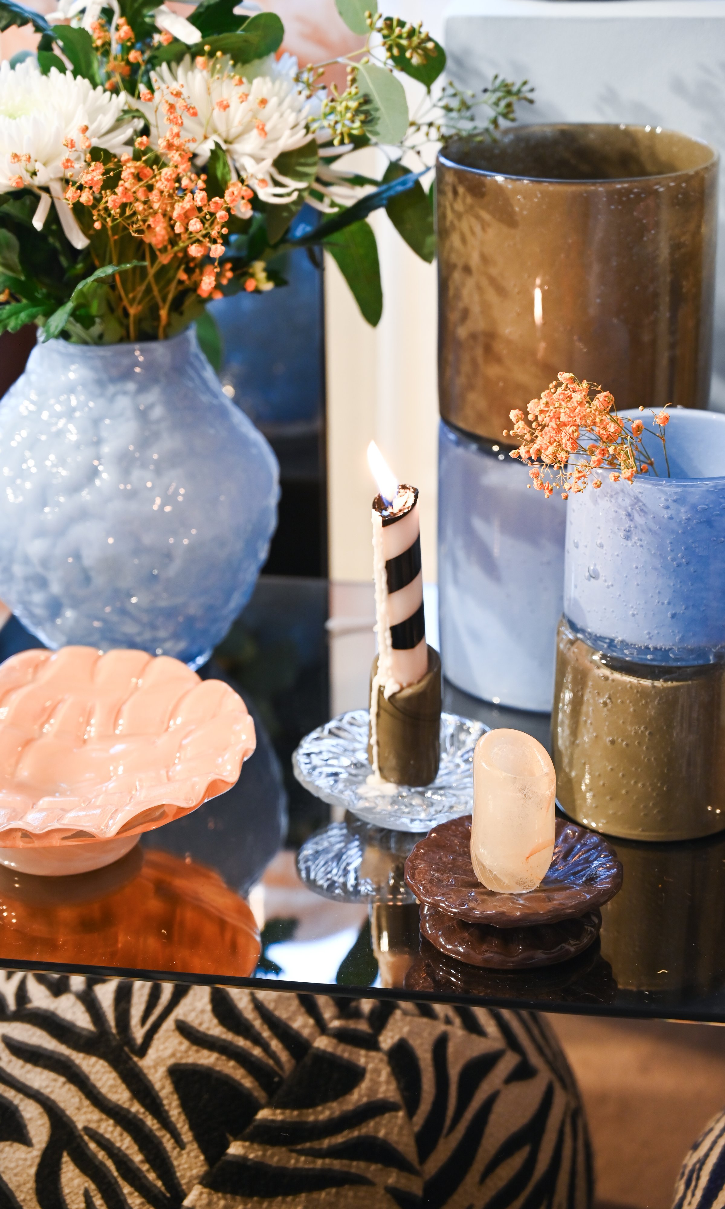 Formerna i kollektionen är levande och fulla av karaktär – som vågor, fisknät och bojlinor förvandlade till skulpturala vaser, bubbligt glas och vågiga fat. Färgskalan rör sig från förtjusande toner av persika till mintig sorbet, smörigt gult och havets blå i alla nyanser, skarpt avbruten av röda accenter som kliver fram och kräver sin plats. Texturerna bjuder in till att upplevas med både händer och blick. Här samsas ikoniska serier med nyheter som för tankarna till havet, värmen och livet i rörelse.